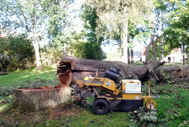 Yksi suurimmista tähän asti jyrsityistä kannoista. Tammen kanto Kotkaniemen kartanon pihamaalla, halkaisija pitkästi yli kaksi metriä!
